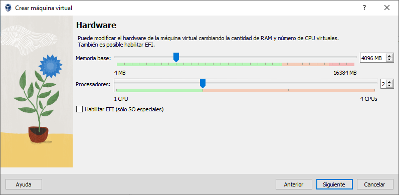 Ahora configuramos la RAM y la CPU en función de su memoria de su computadora, luego damos en siguiente.