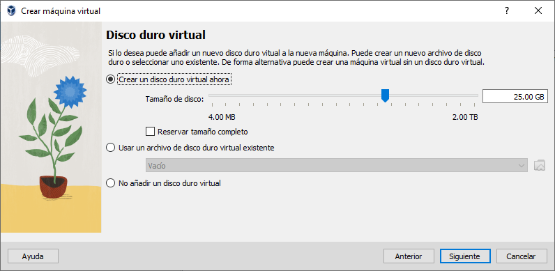 Ahora en la siguiente ventana asignamos el tamaño del disco duro de la VM, en este caso le ponemos 25 GB y le damos el siguiente.