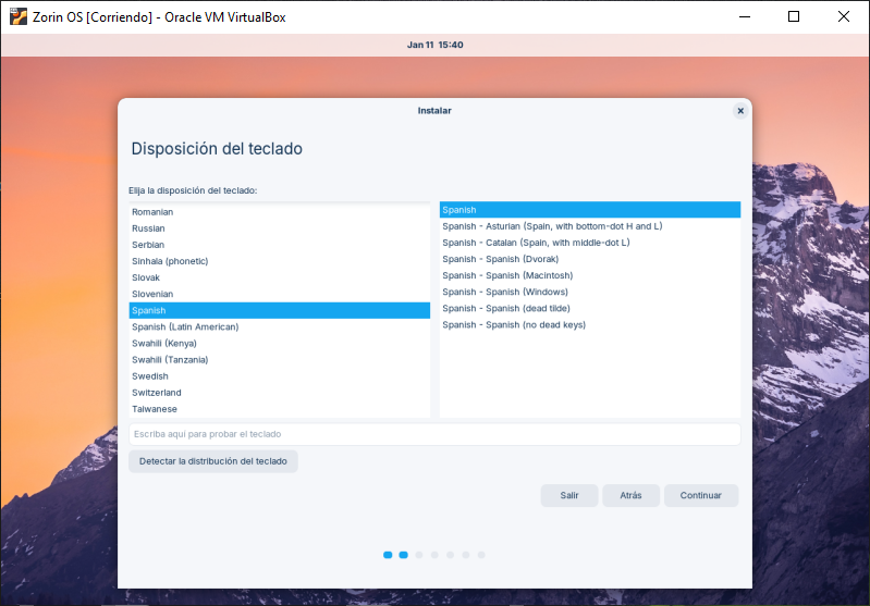 Ahora nos aparece la ventana para la configuración del Teclado, el mismo lo va a detectar por defecto y le damos en continuar.