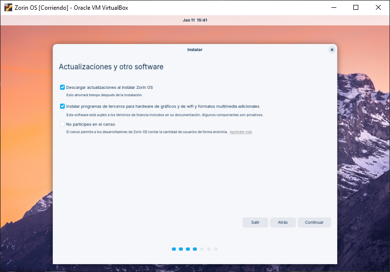 Al instalar Zorin OS, tienes la opción de obtener actualizaciones e instalar aplicaciones de terceros para gráficos, dispositivos Wi-Fi y otros tipos de medios, el le damos en check y en continuar