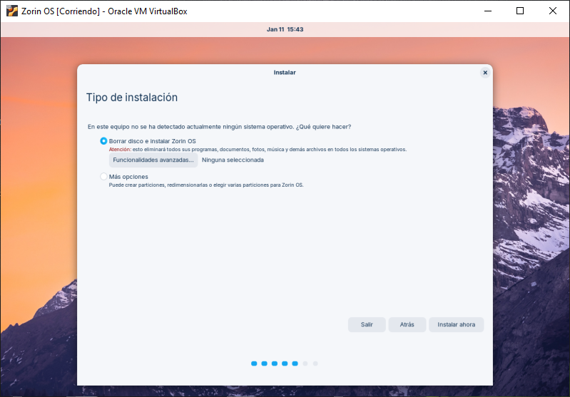 - Mas opciones (Con el fin de crear una partición personalizada para Zorin OS)