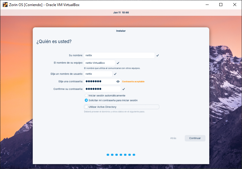 Por último te va a pedir crear una sesion de acceso, el cual agregamos el usuario, la contraseña y nombre del equipo, luego le damos en continuar.